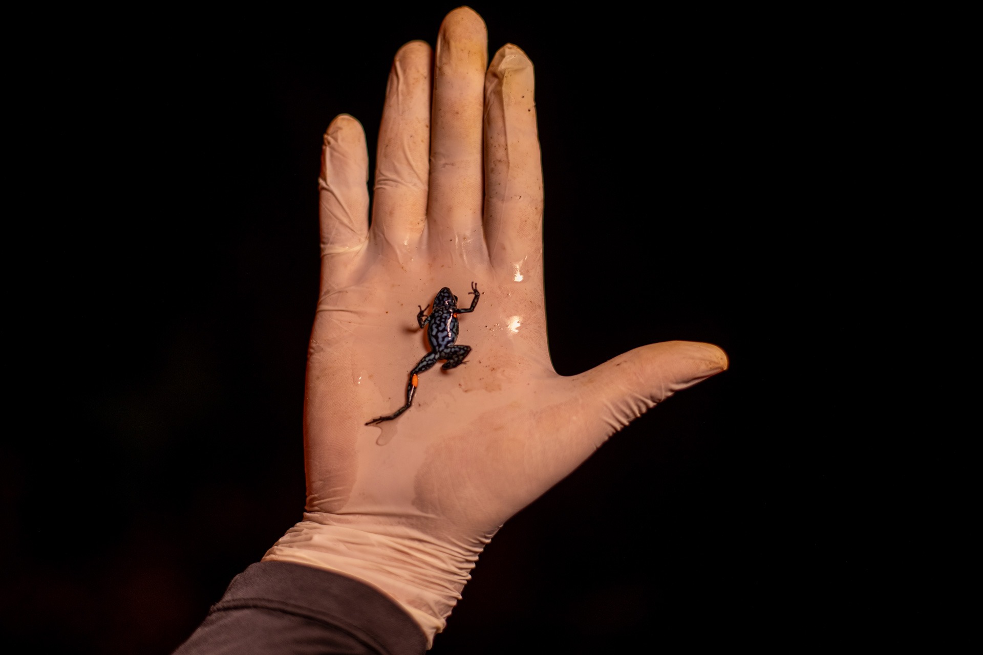 La ameerega ingerí es una rana de dos centímetros, lomo oscuro y granulado. Su panza exhibe intermitentes máculas color azul aguamarina con pequeñas, pero elegantísimas, manchas naranjas en las extremidades. Yulfreiler encuentra y muestra con sus manos enguantadas cuatro individuos de una veintena que, según sus cálculos, pueblan la zona. Aunque no es de las más venenosas, sí segrega una sustancia tóxica que puede causar alteraciones cutáneas inmediatas y fuertes irritaciones. He escuchado de estas ranas en el mercado negro, pero es muy difícil saber cómo salieron de aquí, asegura.