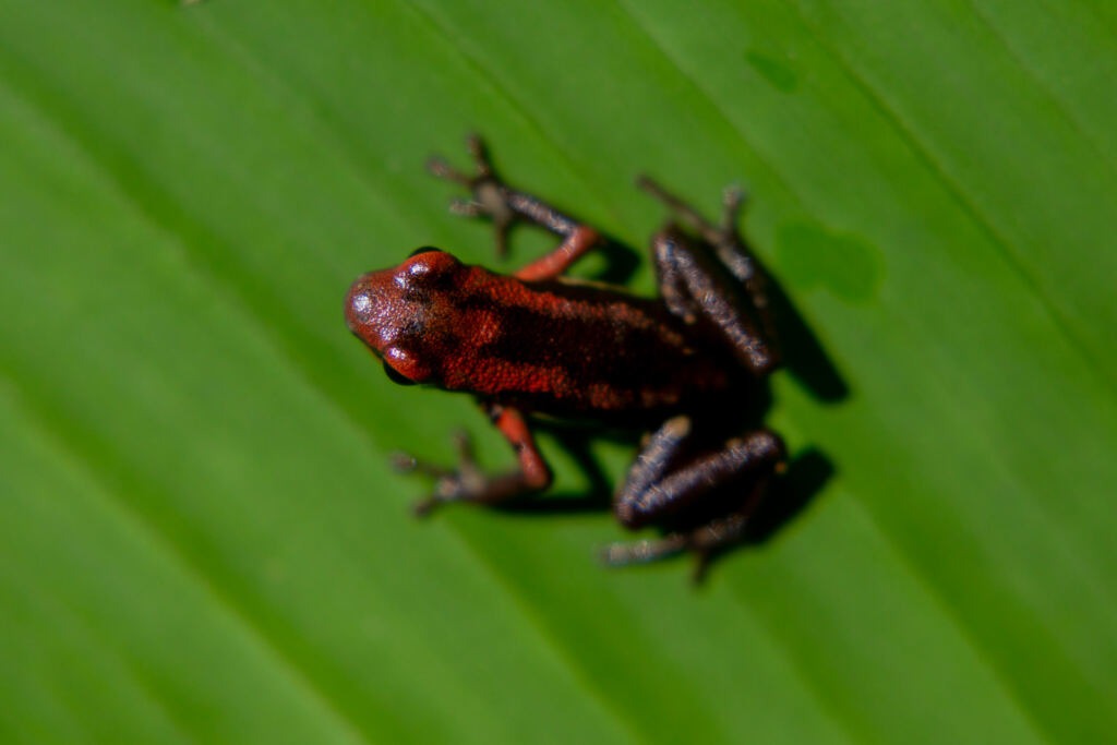 La andinobates bombetes, o rana rubí, forma parte del minúsculo paisaje que se descubre si se sabe examinar la vegetación. El individuo más grande alcanza los dos centímetros y es conocida como el “bicho venenoso que hay que cuidar”. De colores marrones, negros y rojos, desarrollan un croar tan fuerte que pone en tela de juicio su casi invisible tamaño.