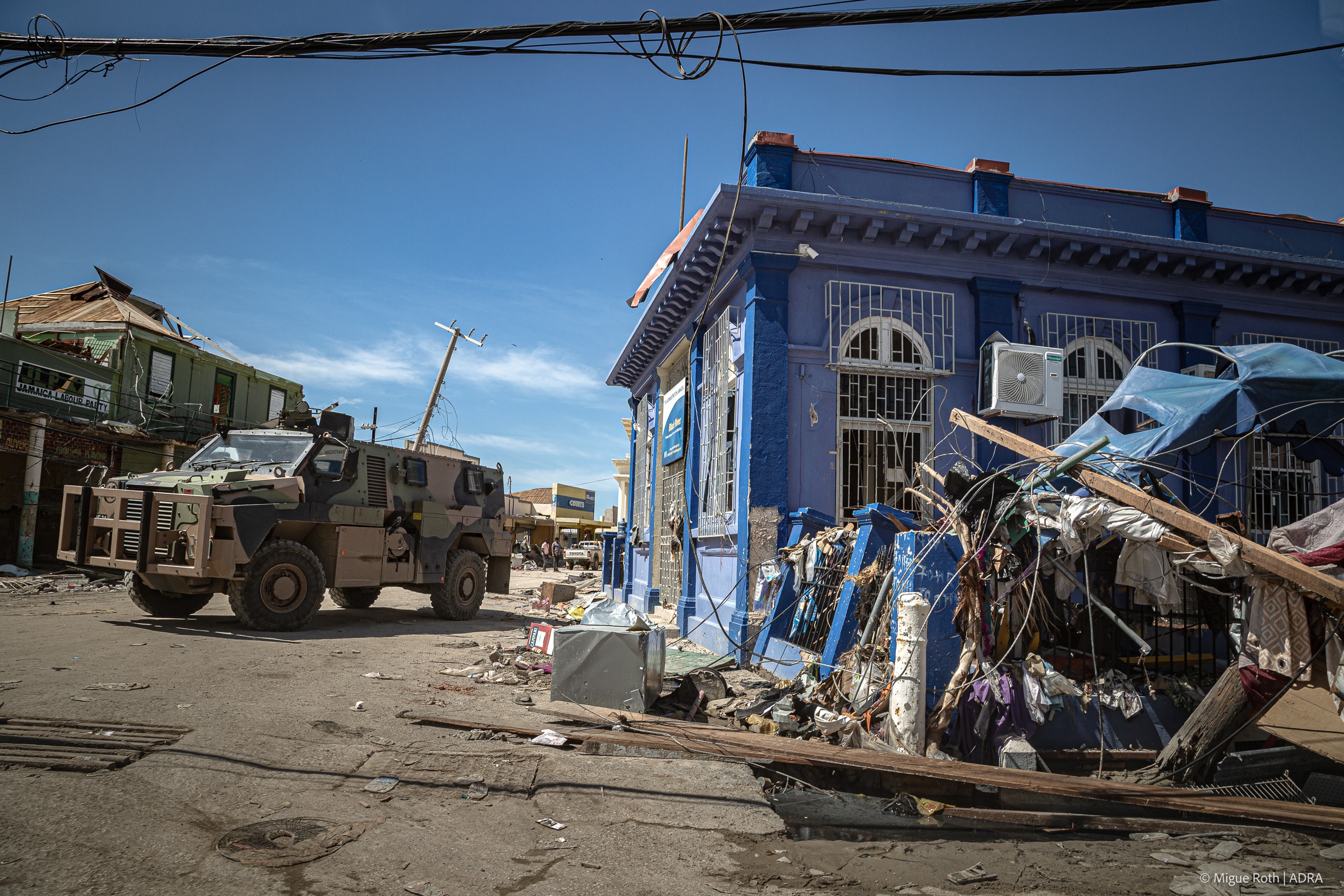 Un vehículo militar patrulla las calles dañadas de Black River. A medida que persiste la escasez y los precios de los productos básicos se disparan, la desesperación aumenta. Algunos han recurrido al saqueo, lo que ha llevado a las autoridades a reforzar la seguridad.