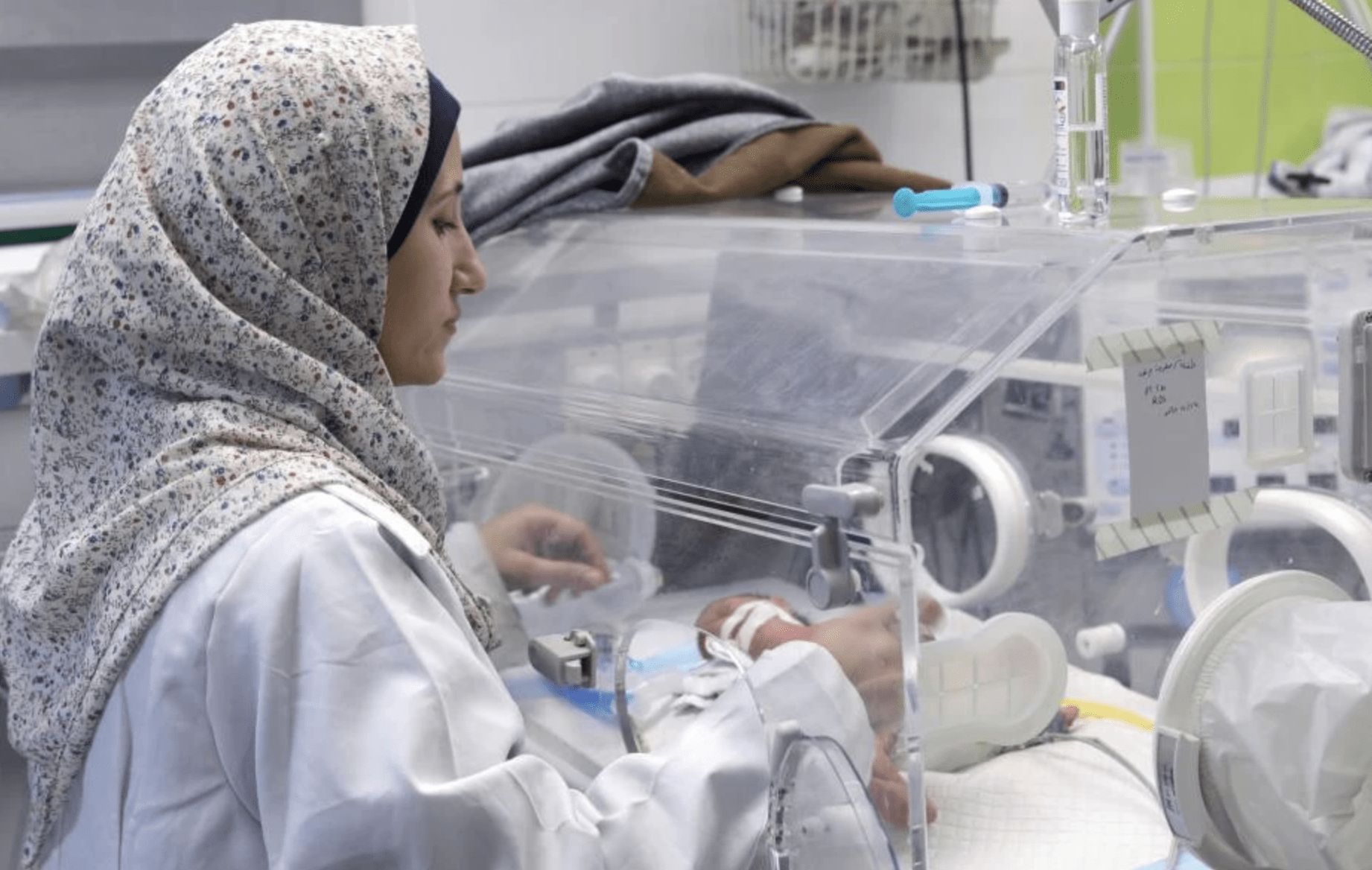 * Una de nuestras enfermeras examina a uno de los recién nacidos prematuros ingresados en la unidad de cuidados intensivos neonatales del Hospital Nasser, en Jan Yunis (Gaza). © Nour Alsaqqa/MSF